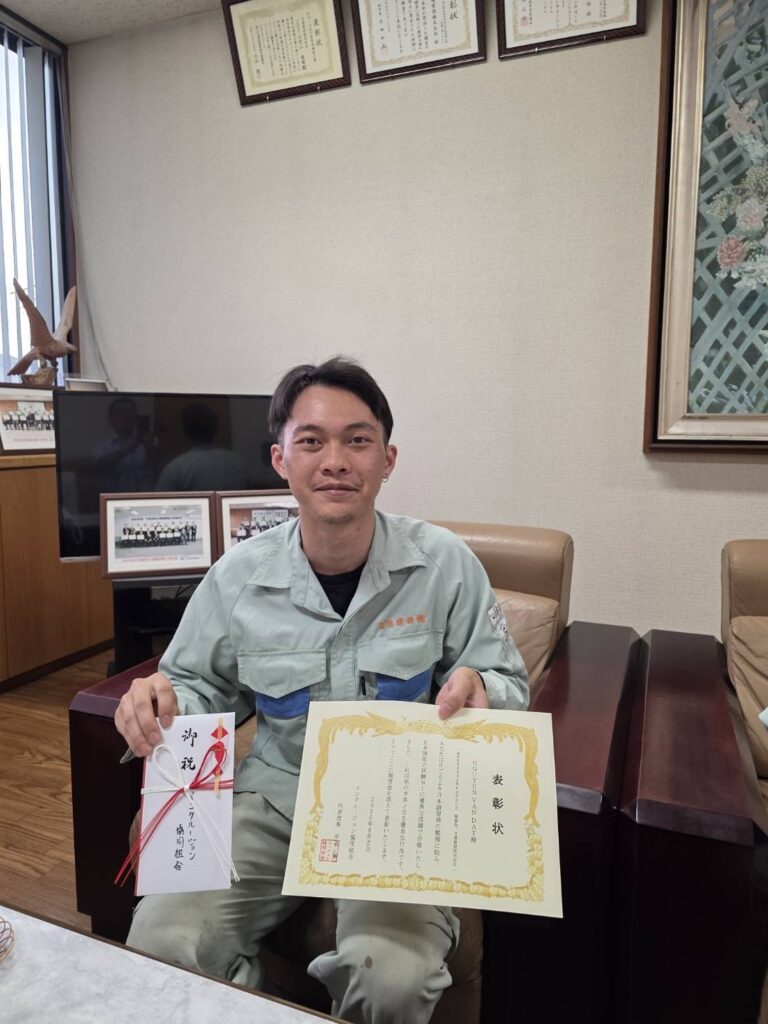 ベトナム人のダットさんは2023年11月1日に技能実習生として来日し、現在は 千葉県🄽建設様で勤務しています。2025年7月に日本語能力試験 jlpt N1 に合格し、インクルージョン協同組合からお祝いの金を受け取りました。